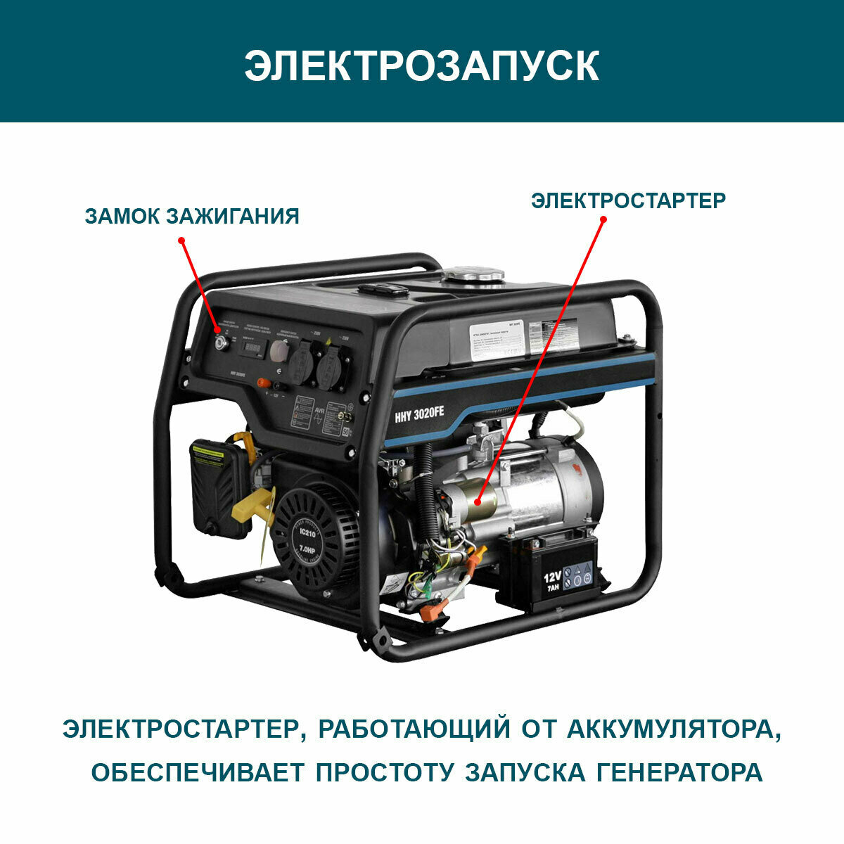 Бензиновый генератор Hyundai HHY 3020FE, 220/12 В, 3.1кВт, с АКБ