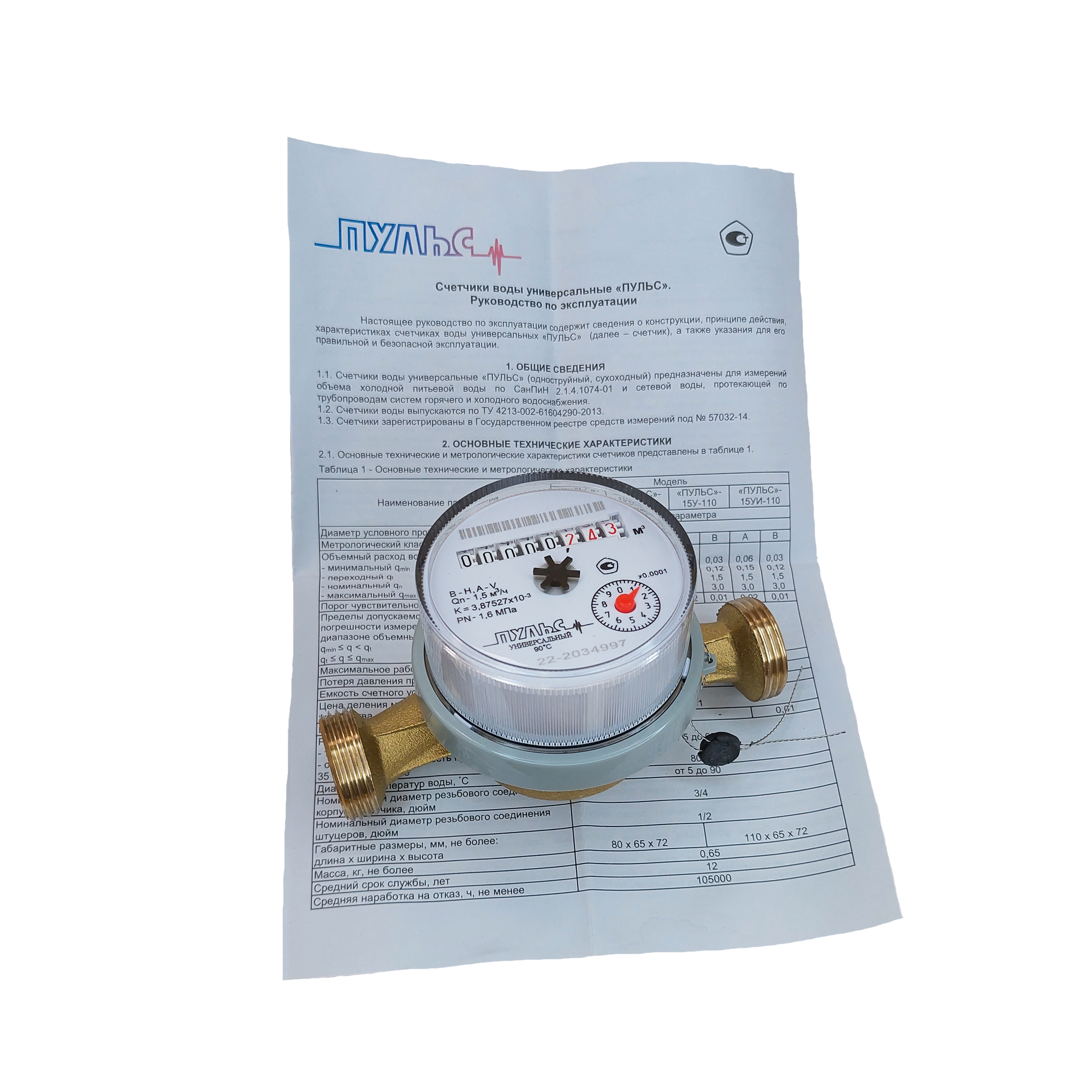 Счетчик воды/водосчетчик Пульс 15У-110, Ду15, 110 мм, универсальный, для холодной и горячей воды, с монтажным комплектом, безимпульсный