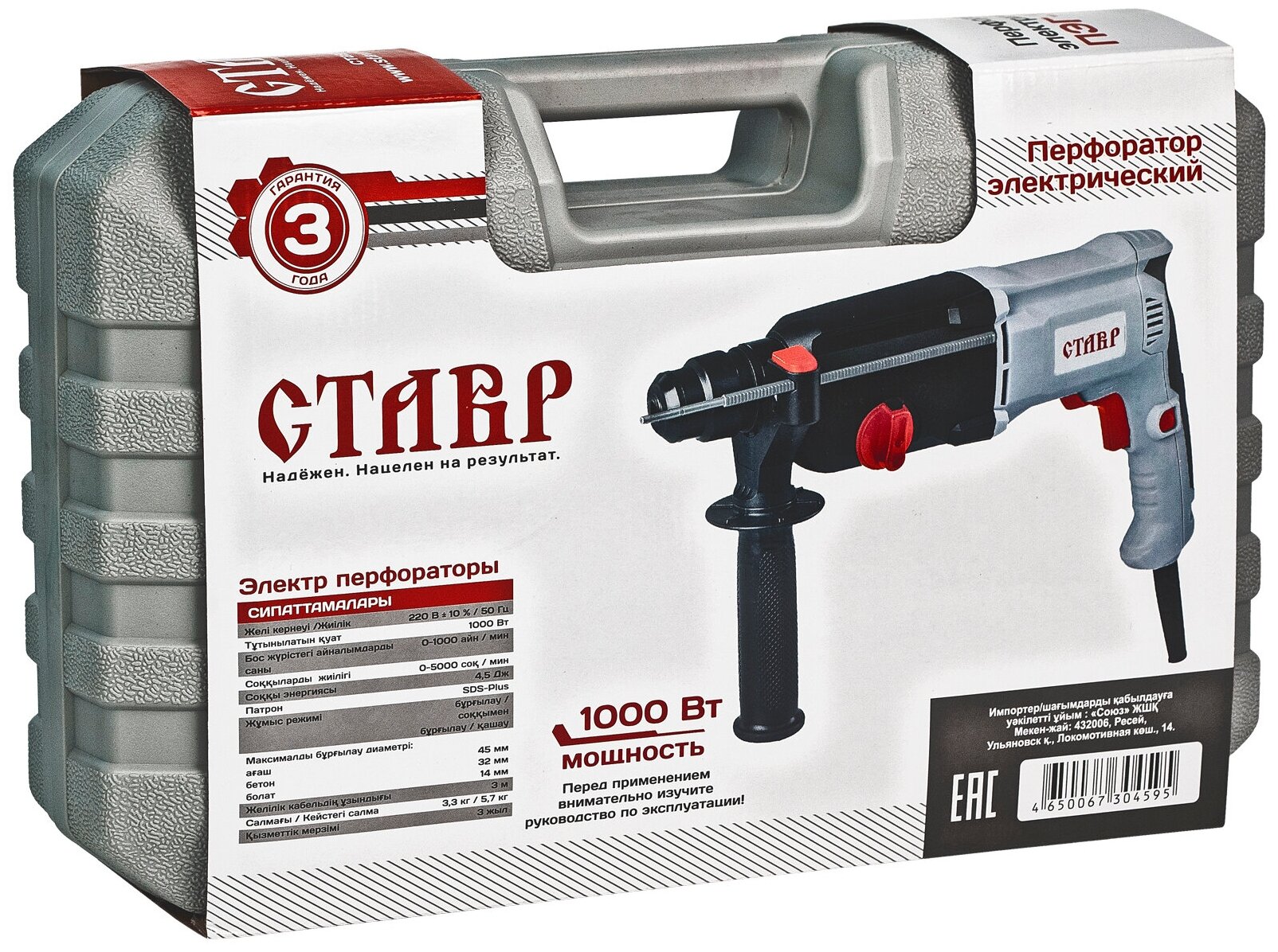 Ставр ПЭГ-1000 (4шт) Перфоратор 1000Вт, 0 -1000об/мин, 0- 5000уд/мин, 4,5Дж, 3 режима работы, реверс, SDS-plus, в кейсе ( 3 бура, 1 пика, 1 долото, ключевой патрон), длина сетевого кабеля 3м