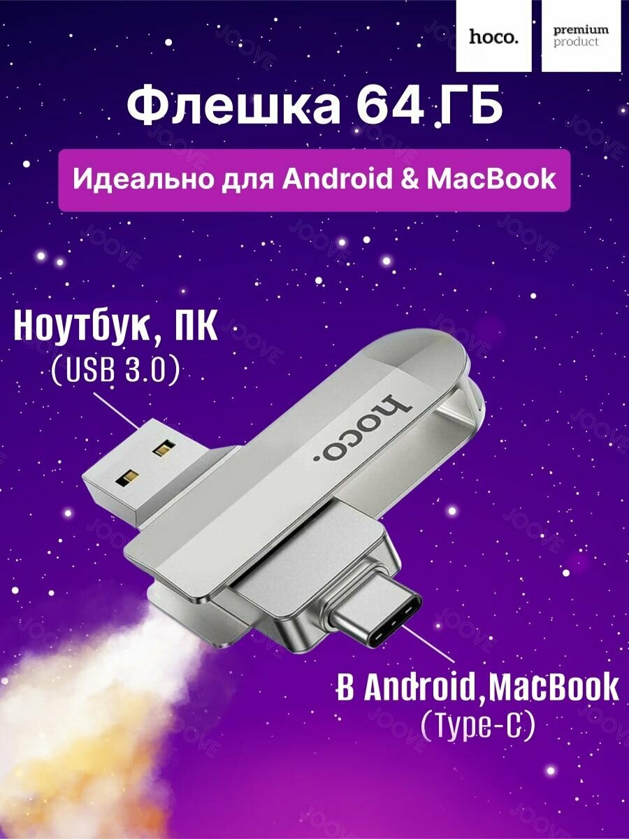 USB Флеш-накопитель для смартфонов, Hoco UD10, USB Type-C, 64 Гб, Серебристый.