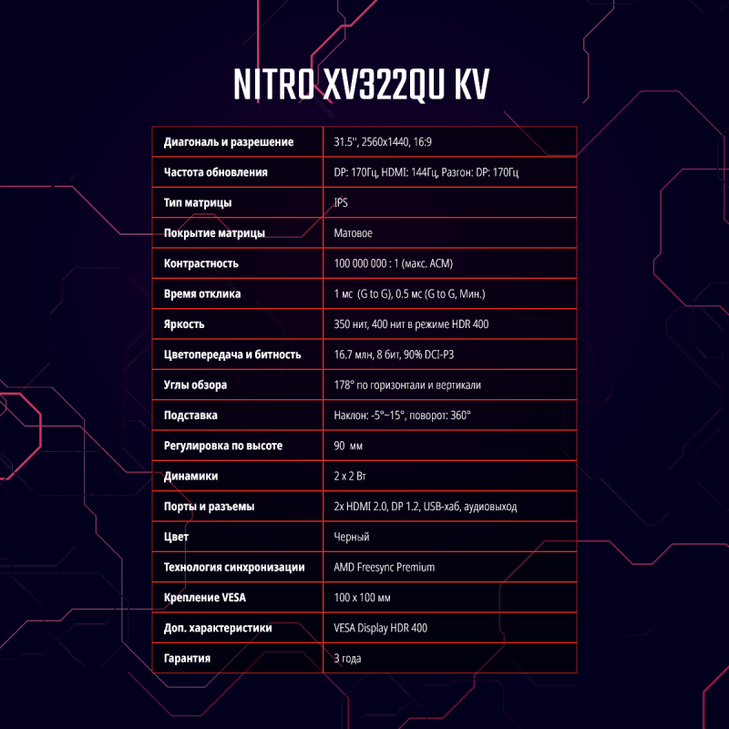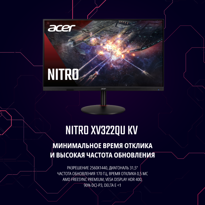 Монитор 31,5" ACER Nitro XV322QUKVbmiiprzx, IPS, 2560x1440, 170Hz, 1ms, 350 nits, 178°/178°, 2xHDMI + DP + Audio out + USB3.0x4 Hub + USB-B+ Колонки 2Wx2 , FreeSync Premium, HDR 400 (NEW)