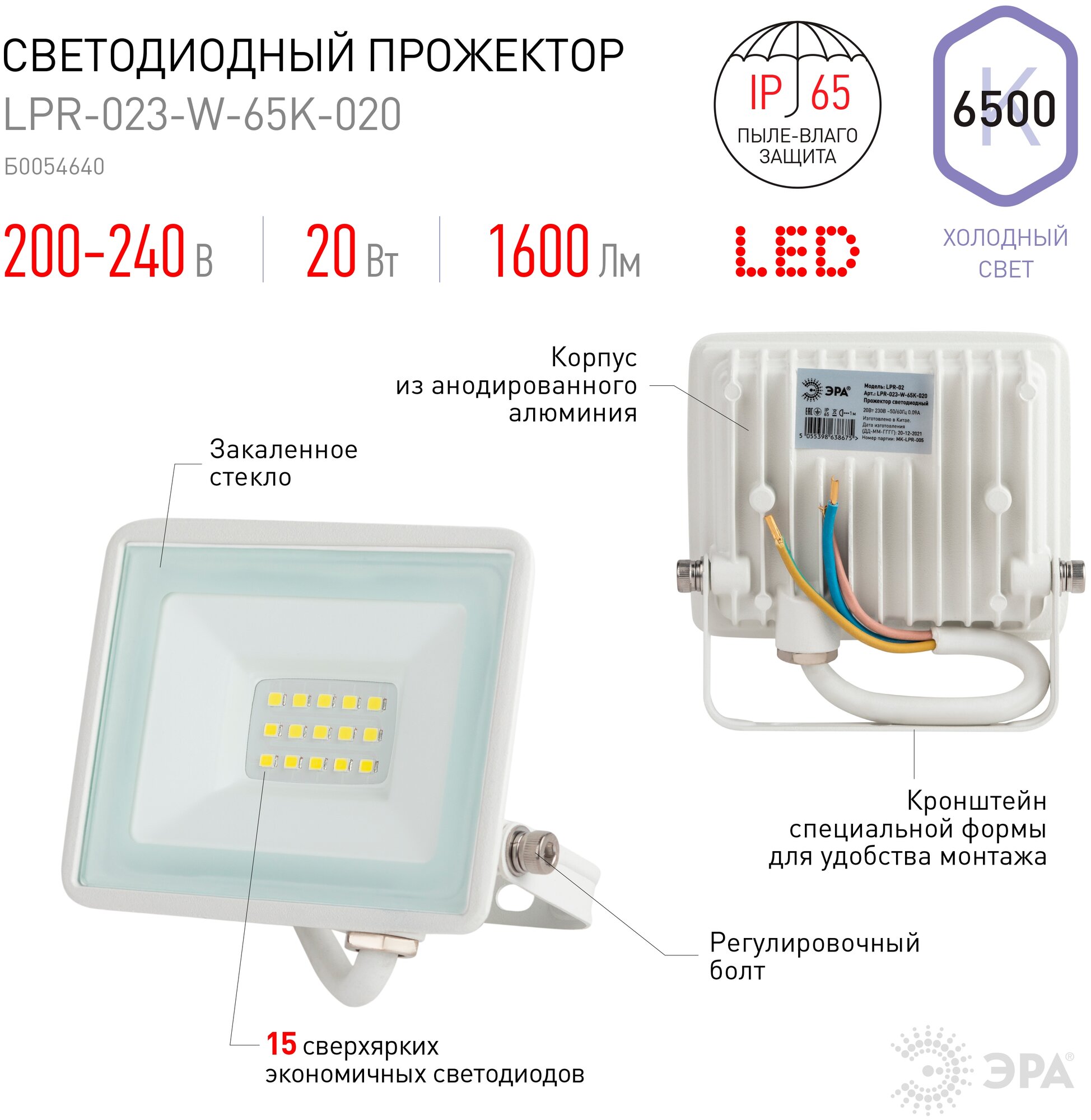 Прожектор светодиодный LPR-023-W-65K-020 20Вт 6500К 1600лм IP65 уличный бел. | код. Б0054640 | Эра ( 1шт. )