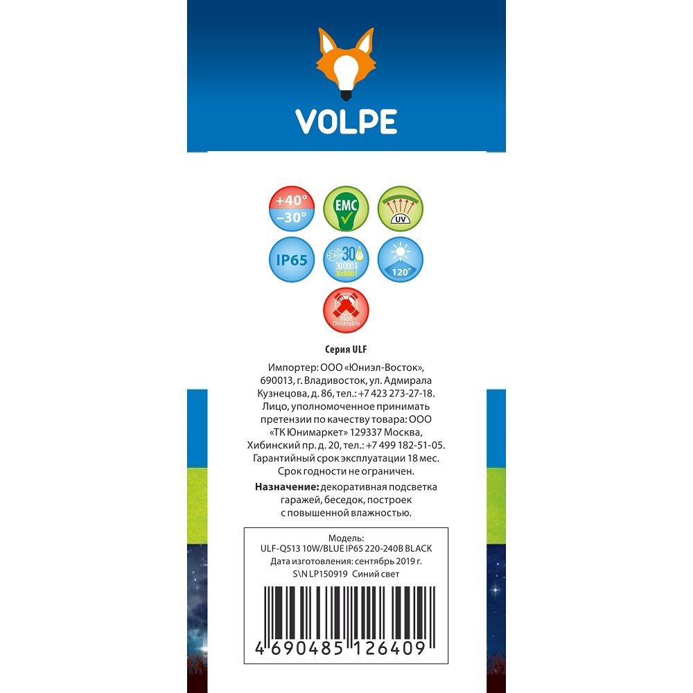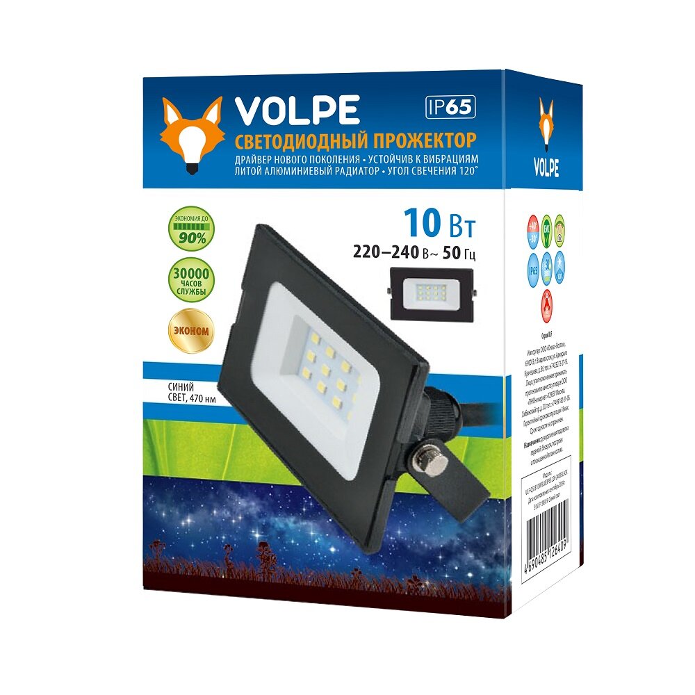 Светодиодный прожектор Volpe ULF-Q513, 10 Вт, синий свет, IP65, черный 9668678