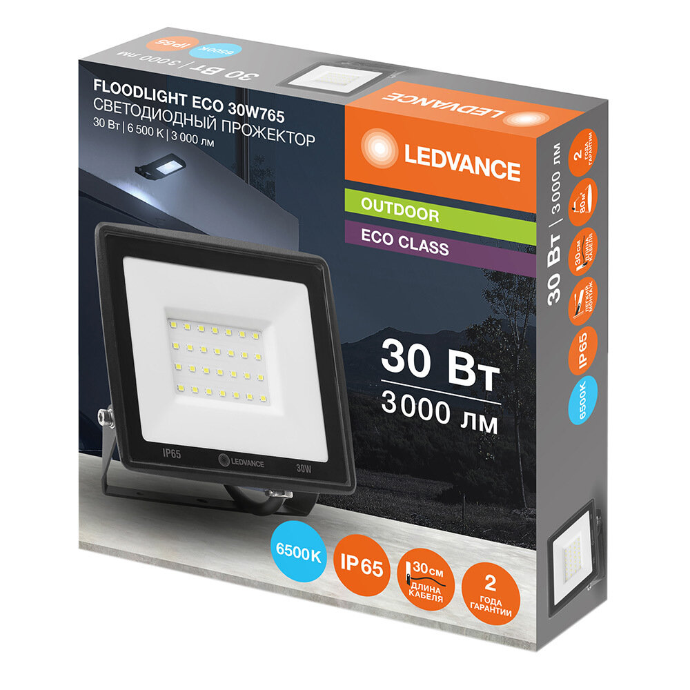 Прожектор светодиодный LEDVANCE Eco Class Floodlight LED 30W/2700/6500K Black IP65, 30 Вт, свет: холодный белый