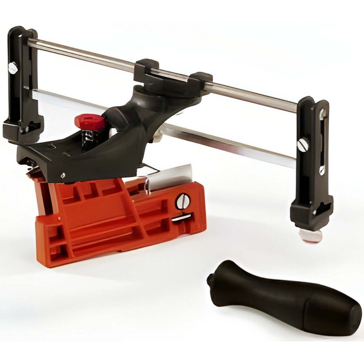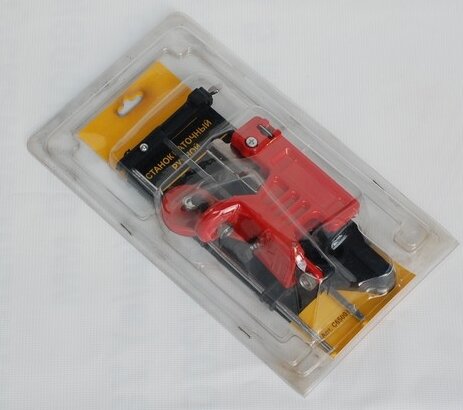 Вся криво собрана, нужно доработать напильником. При первой заточке выскочила ось. Также клинит направляющая напильника, хотя на фетр масло капал. Единственный плюс- заточка качественней, чем электрической точилкой. |