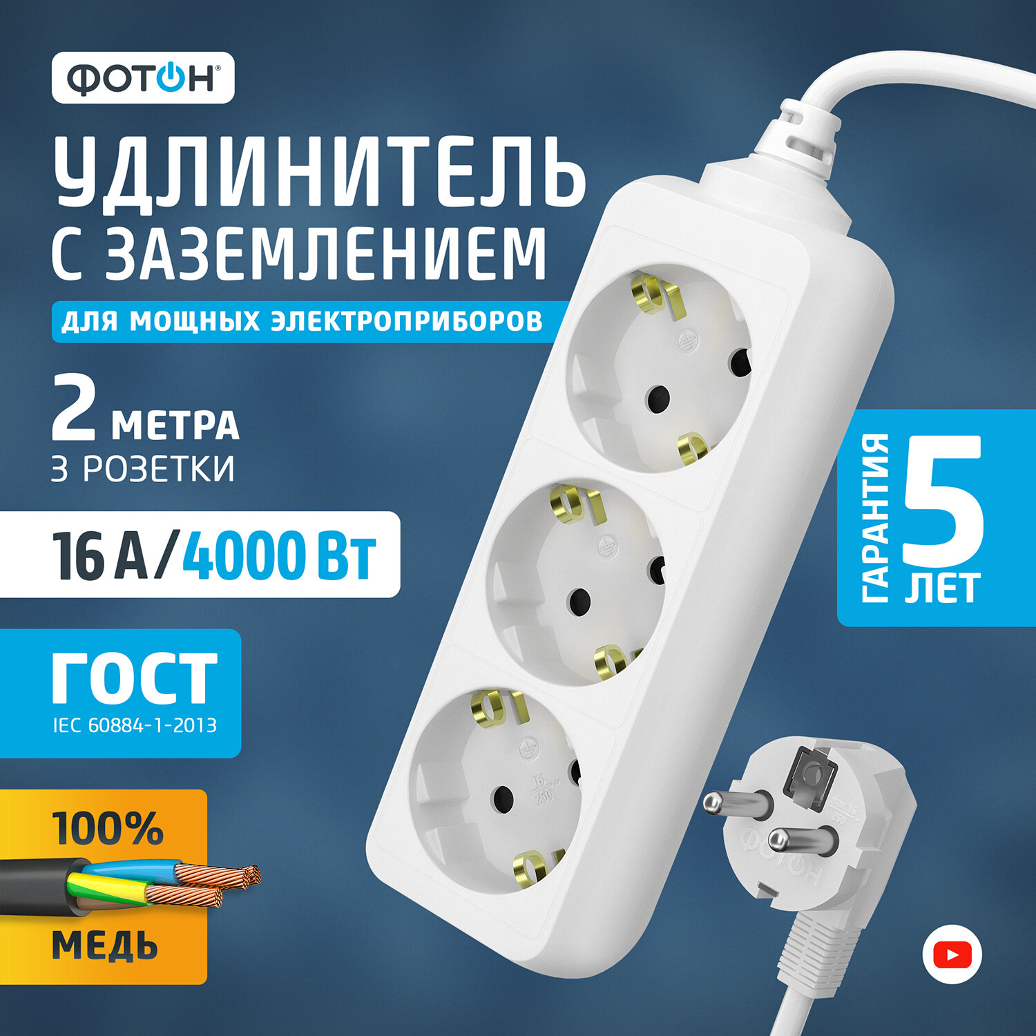 Удлинитель сетевой для розетки фотон 16А 2м 3 розетки с заземлением белый, ГОСТ