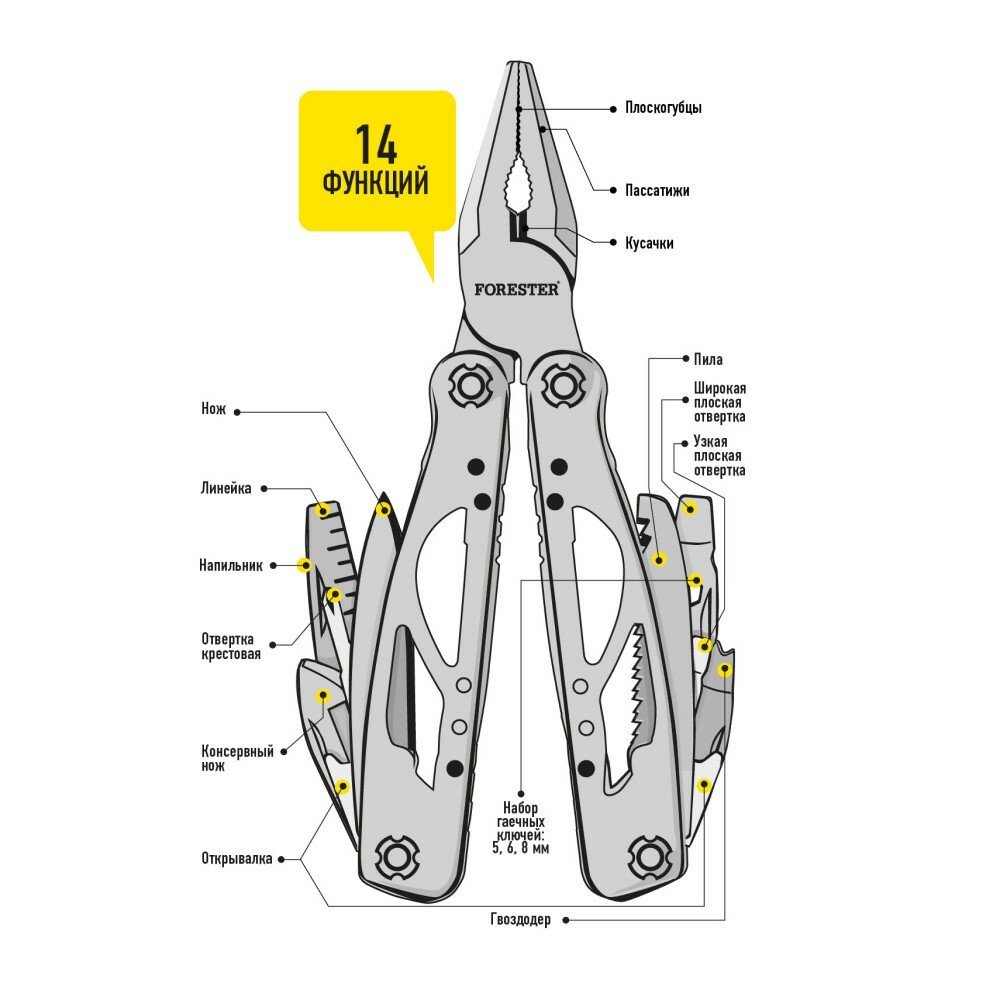 Купить Forester MOBILE Мультитул, набор инструментов 14 функций - плоскогубцы,пассатижи, кусачки, нож,