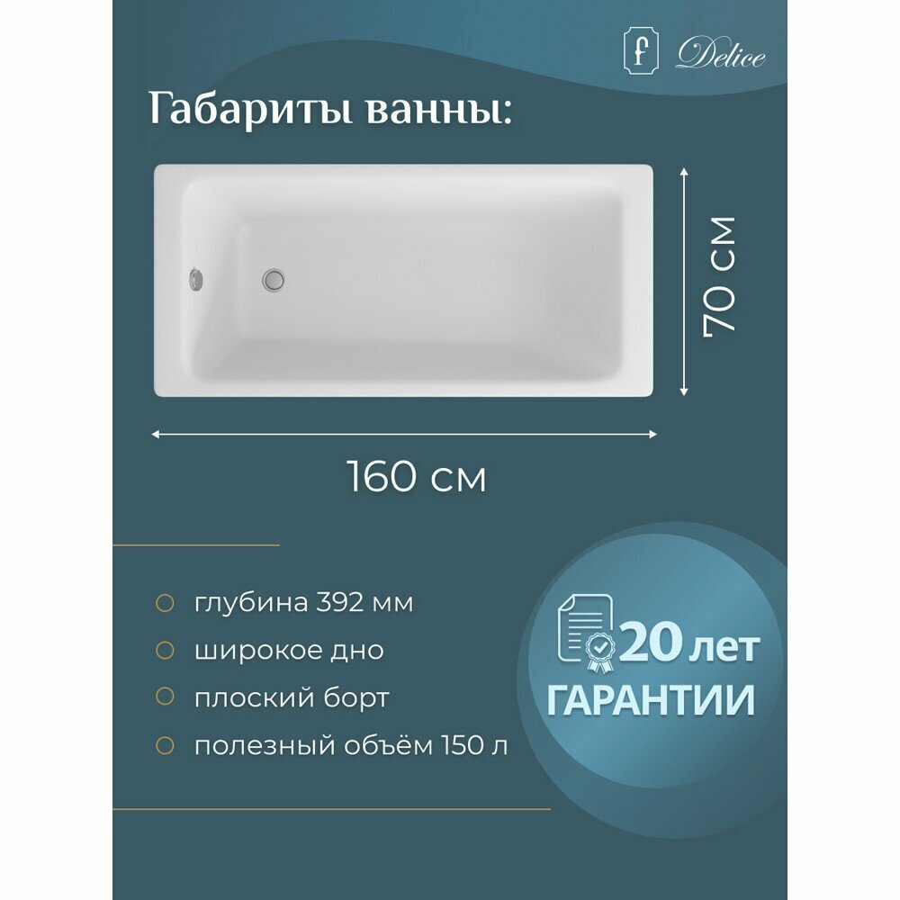 Ванна чугунная Delice Parallel 160x70 DLR220504, без ручек, без ножек