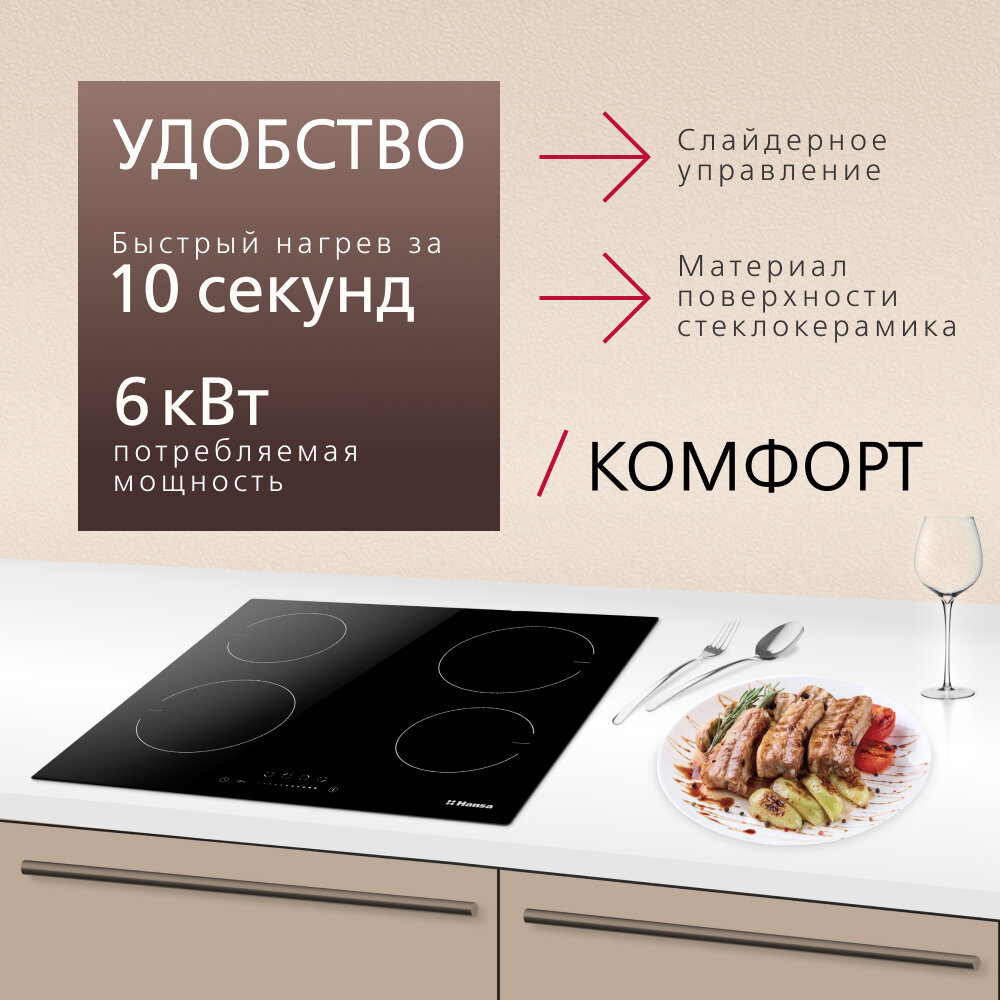 Электрическая варочная панель Hansa BHC633008, стеклокерамическая поверхность, блокировка от детей, таймер, автоотключение, индикация остаточного тепла, черная
