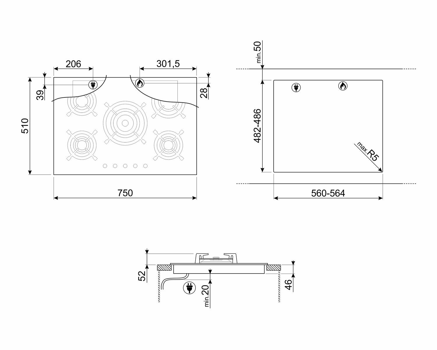 Газовая варочная панель Smeg PV675CNR, черное стекло + медный профиль, 5 конфорок, конфорка с 3-м пламенем, электроподжиг, газконтроль, чугунные решетки