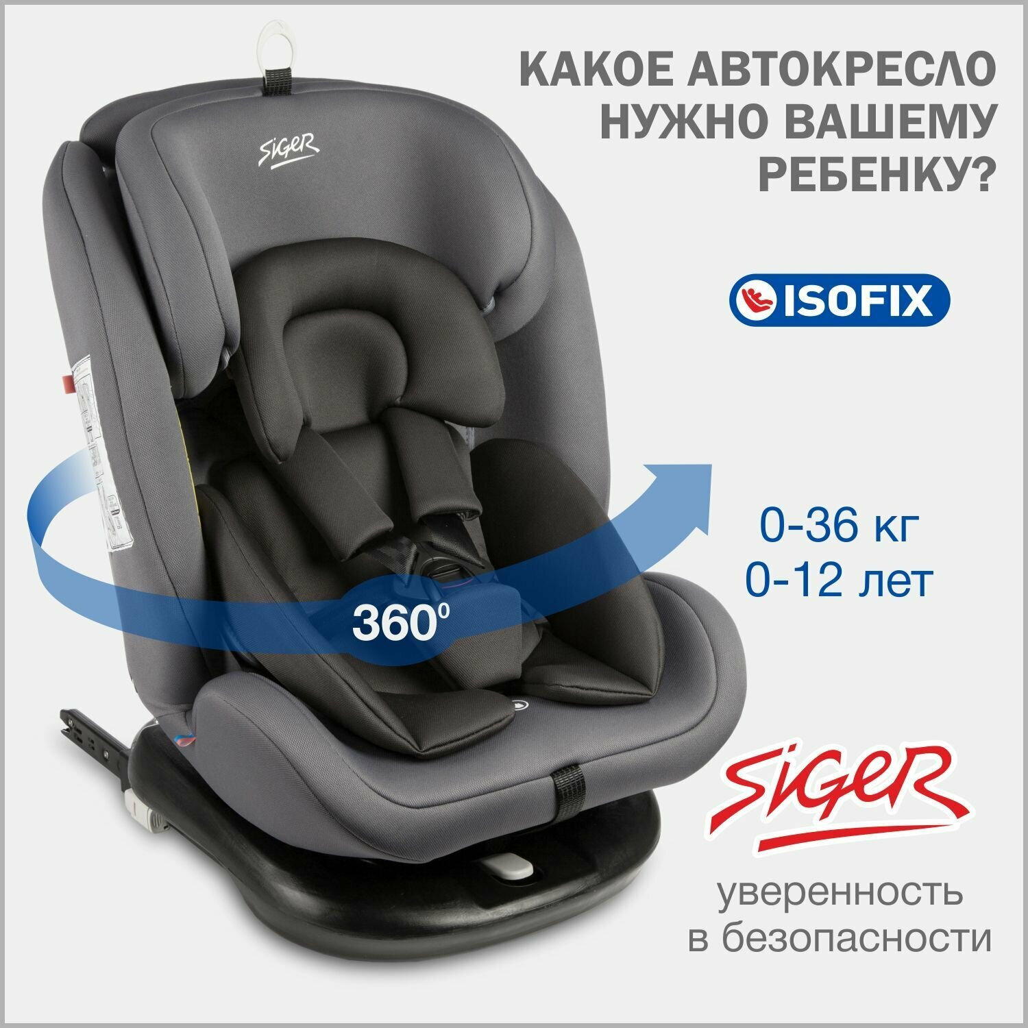 Автокресло детское поворотное с рождения до 12 лет / Isofix / 0+/1/2/3/до 36 кг 0-36кг / 0-12лет, Siger Престиж , маренго