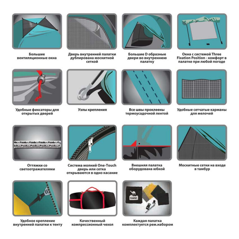 | Особенности | УФ-защита / вентиляционные отверстия / ветрозащитная/снегозащитная юбка / внутренние карманы / внутренняя палатка / навес / огнеупорная пропитка / проклеенные швы |