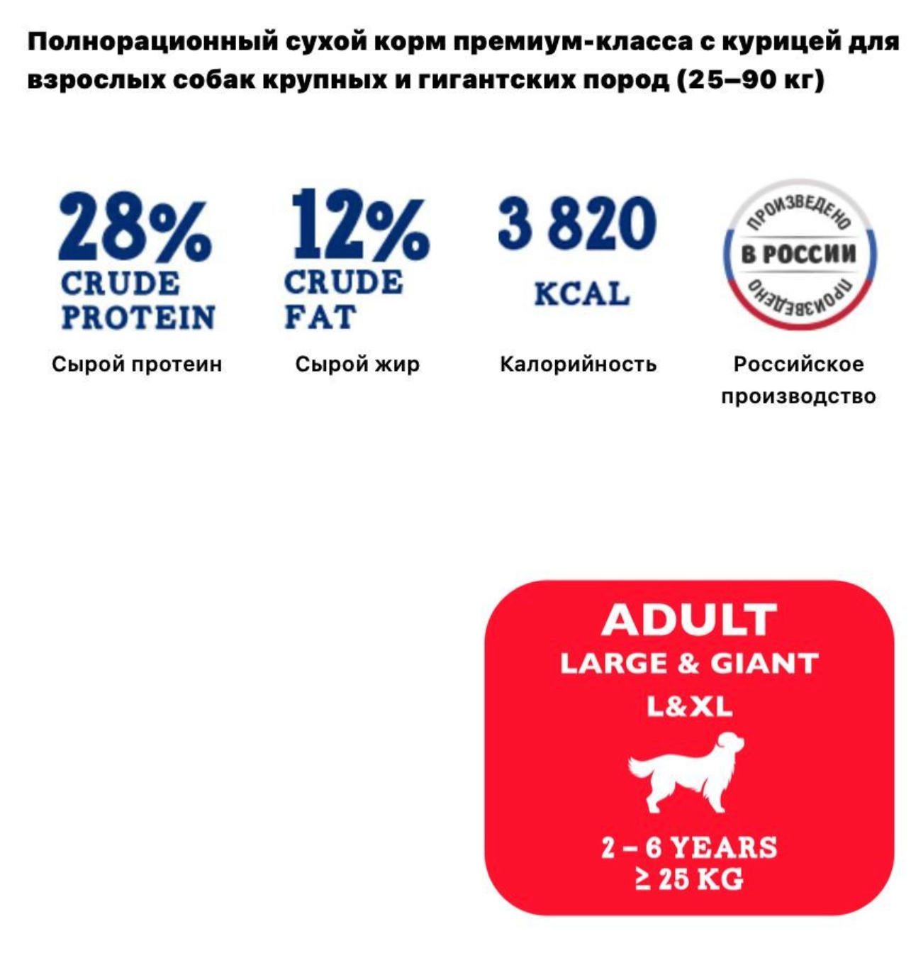 Сухой корм премиум класса с курицей для взрослых собак крупных и гигантских пород