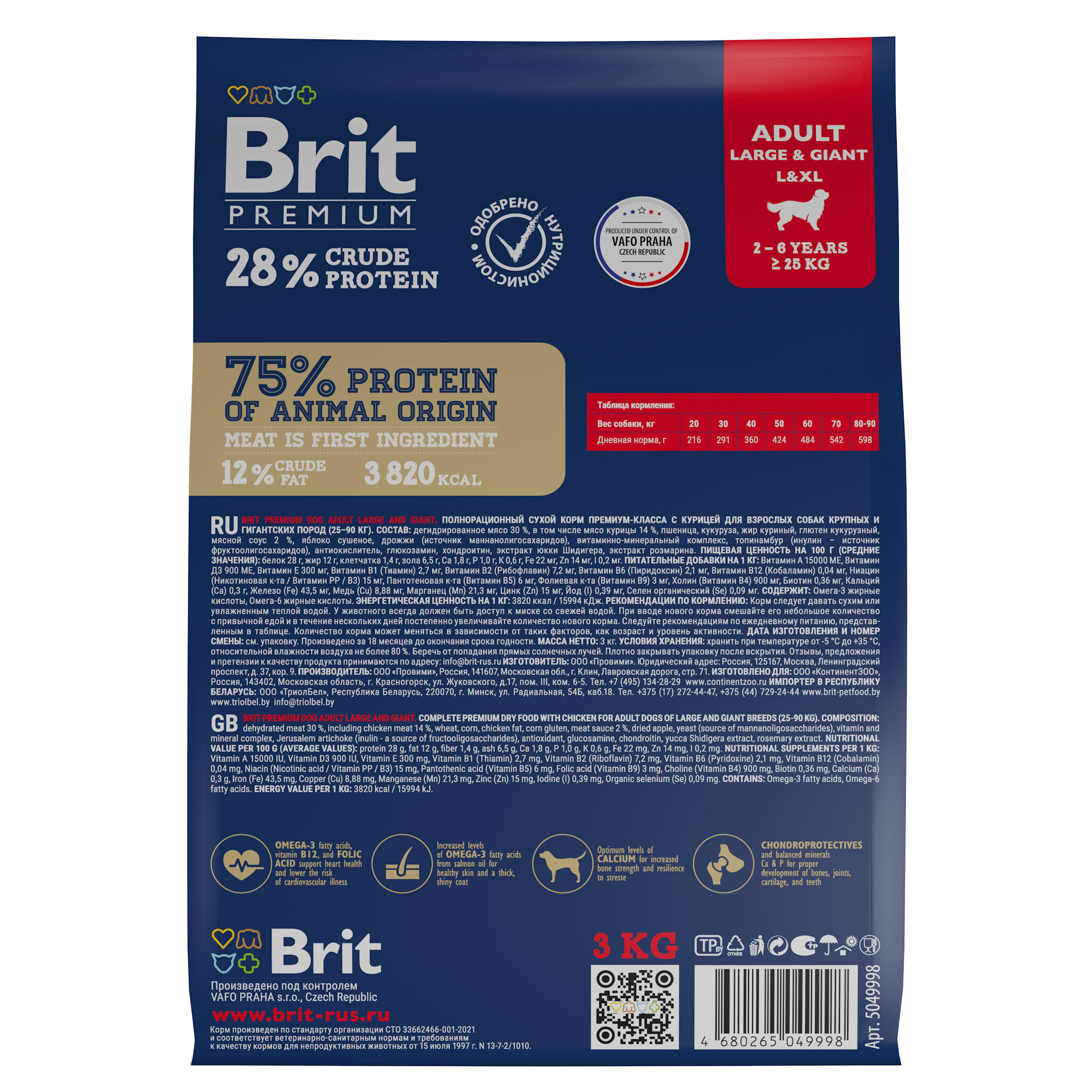 Корм Brit Premium Adult Large & Giant для собак крупных и гигантских пород, с курицей, 3 кг