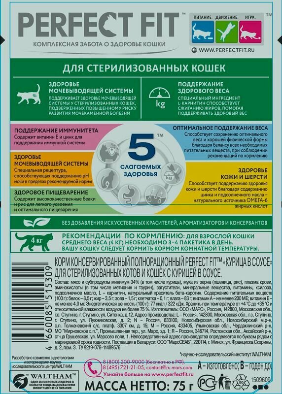 Ниже Вы можете прочитать отзывы на Влажный корм Perfect Fit для стерилизованных кошек, курица в соусе, 75 г, ознакомится с подробными характеристиками, посмотреть интересные обзоры и фотографии на Влажный корм Perfect Fit для стерилизованных кошек, курица в соусе, 75 г.