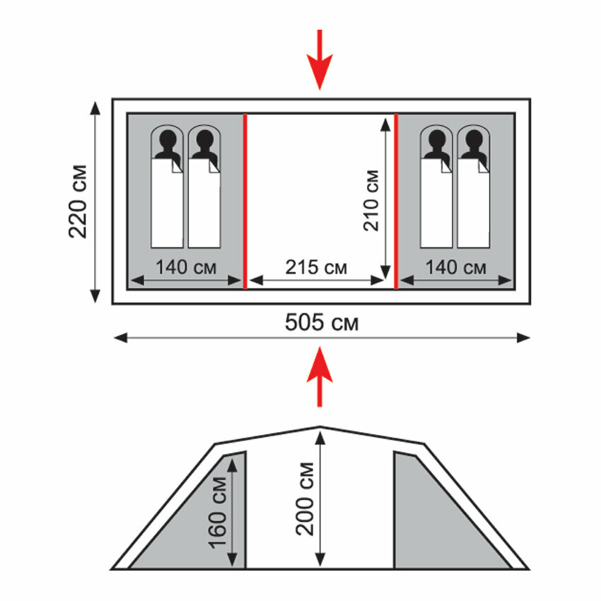 | Габариты внешней палатки(ДxШxВ) | 505x220x200 cм |