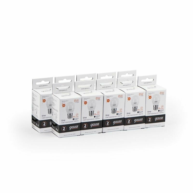(10 шт)Лампа Gauss Elementary Шар 8W 520lm 3000K Е27 LED 1/10/100