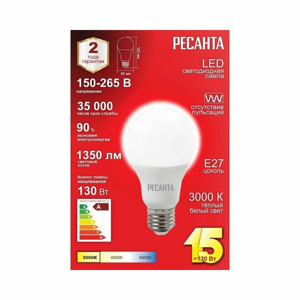 Лампа Светодиодная 230V Бытовая 15W E27 3000K Ресанта Ll-R-A65 1 Шт. Картон 76/1/19 Ресанта арт. 76/1/19