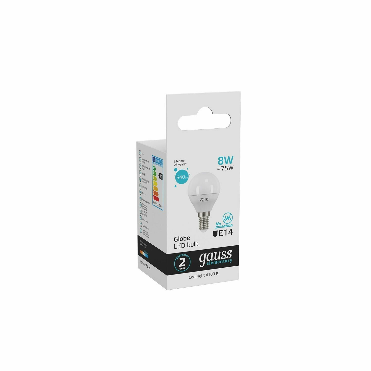 (5 шт)Лампа Gauss Elementary Шар 8W 540lm 4100K Е14 LED 1/10/100