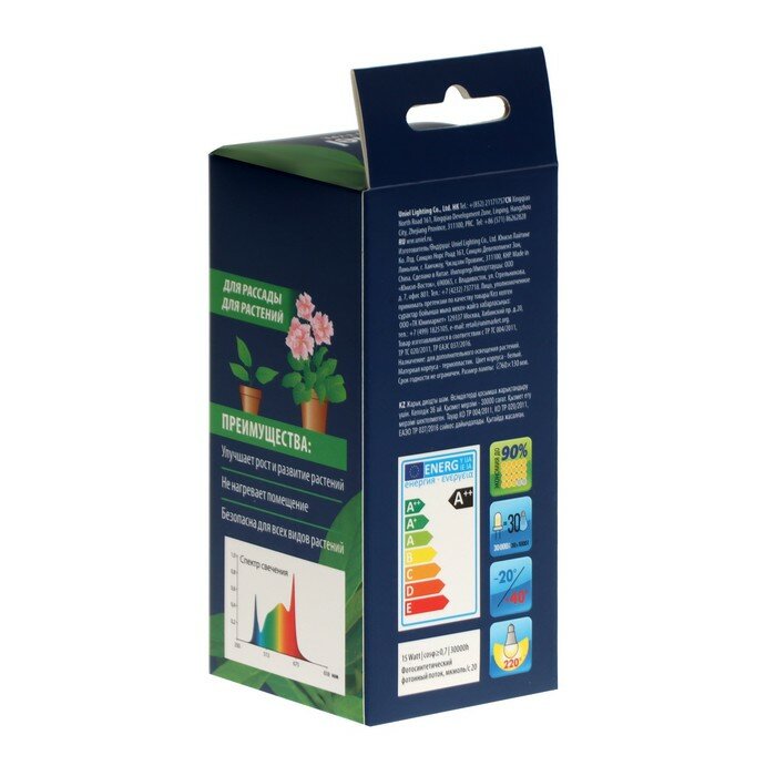| Дополнительная информация | спектр для фотосинтеза; материал корпуса: термопластик; диапазон рабочих температур, °С: от -20 до +40; класс энергопотребления: А++; угол светового потока, °: 220; фотосинтетический фотонный поток, мкмоль/c: 20 |