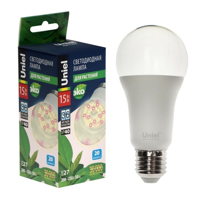 Купить Uniel Фитолампа светодиодная Uniel, А60, Е27, 15 Вт, 250 В, 220°, спектр для фотосинтеза
