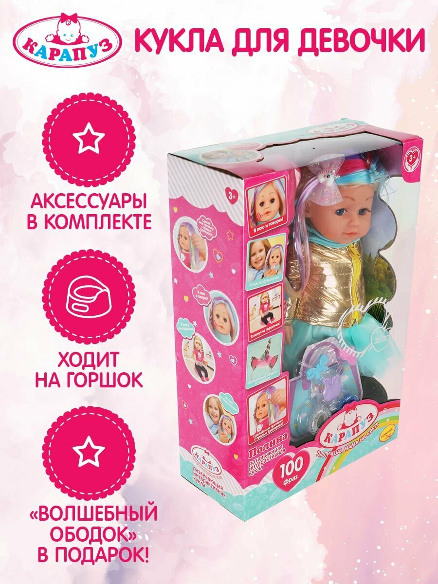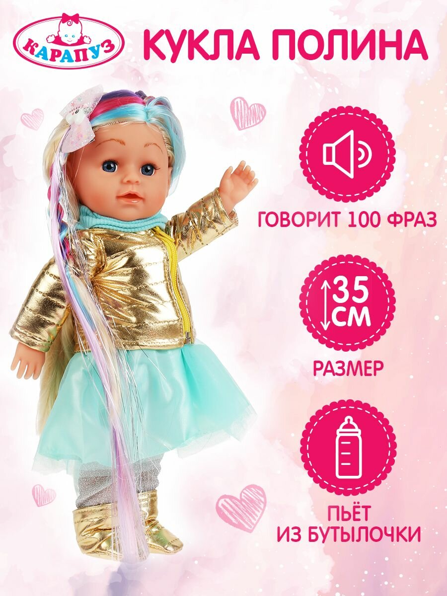 Кукла Карапуз "Полина", абвгдейка песня, функциональная, 35 см, с цветными прядями, 9 аксессуаров (314635)