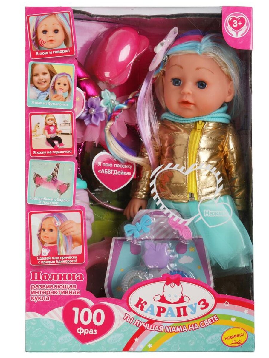 Карапуз Кукла функциональная абвгдйка песня Полина 35см с цветными прядями, 9акс,кор карапуз в кор.12шт