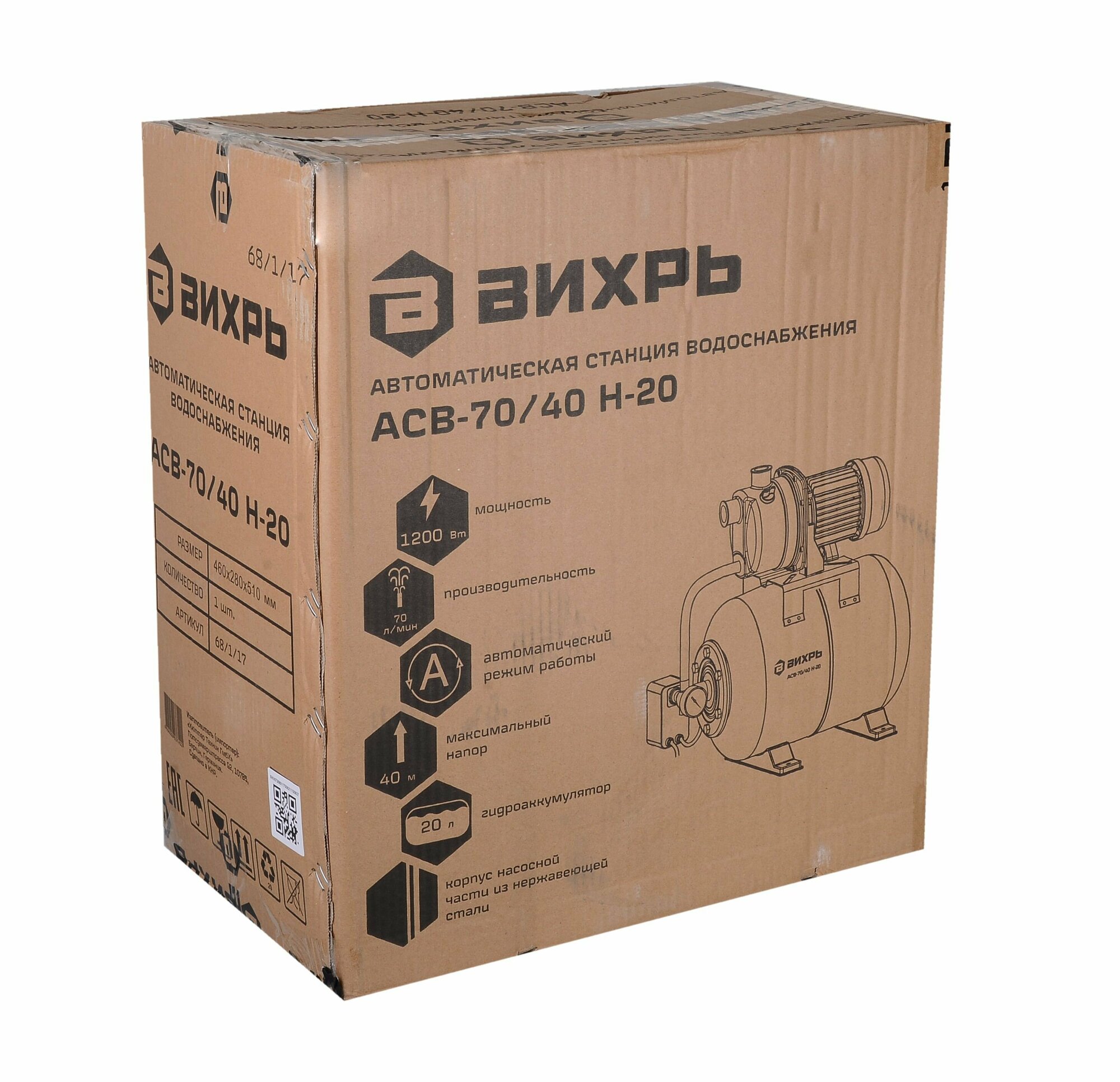 Автономная станция водоснабжения Вихрь АСВ-70/40 Н-20, 1200 Вт, напор – 40 м, 70 л/мин, гидроаккумулятор – 20 л
