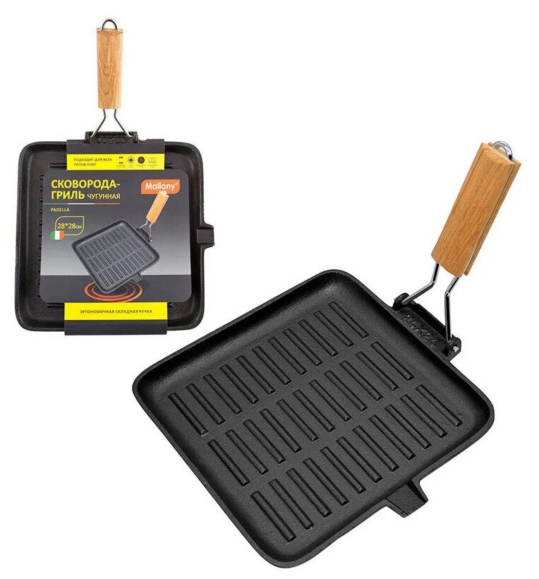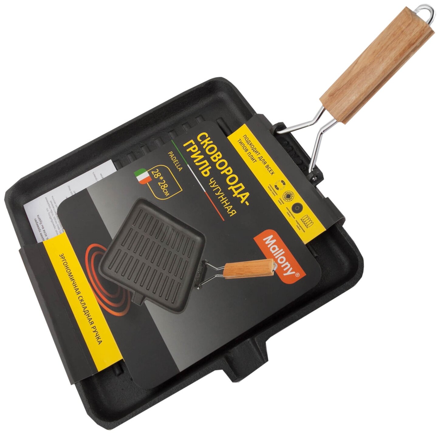 Сковорода-гриль Mallony , чугунная, с деревянной складной ручкой, 28X28 см