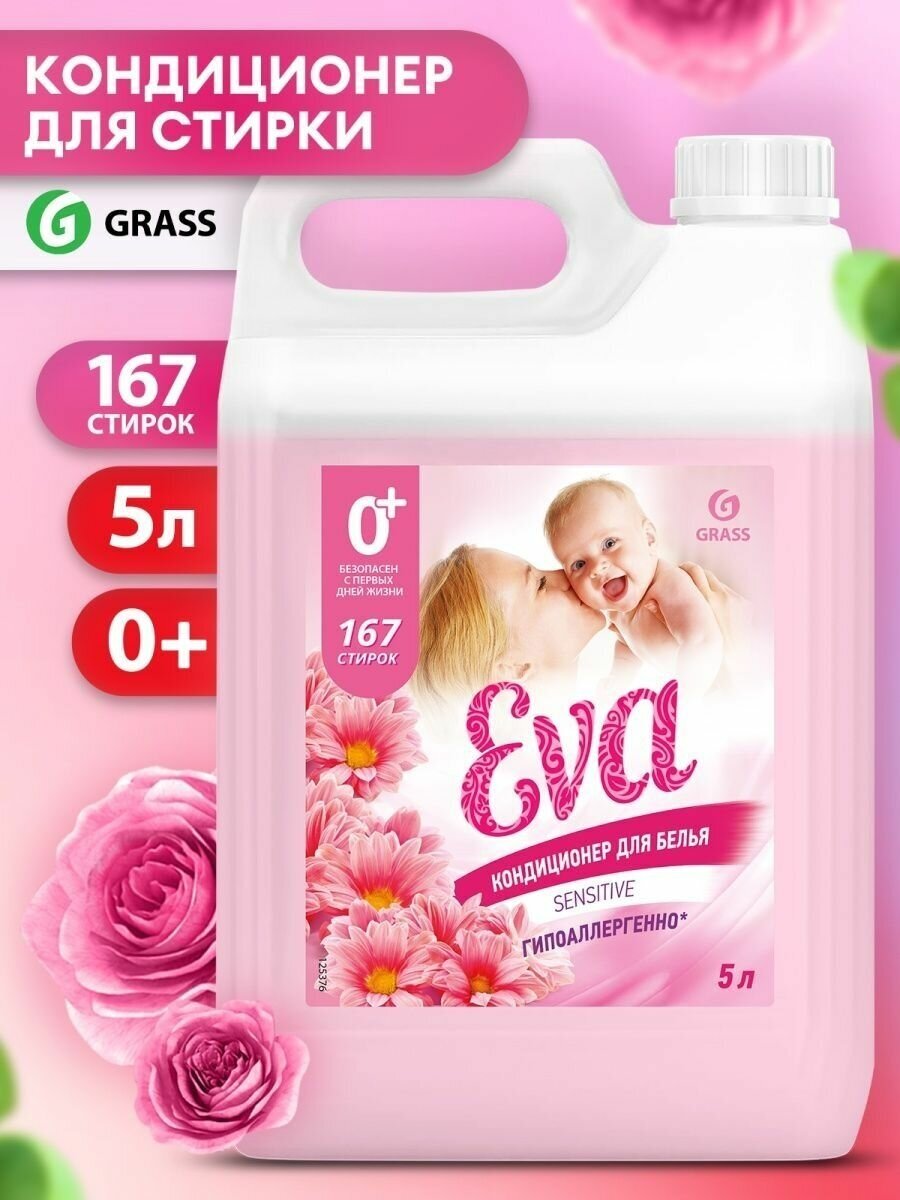 Кондиционер - ополаскиватель для белья универсальный GRASS Eva SENSITIVE 5л,167 стирок, гипоаллергенный концентрат со свежим ароматом