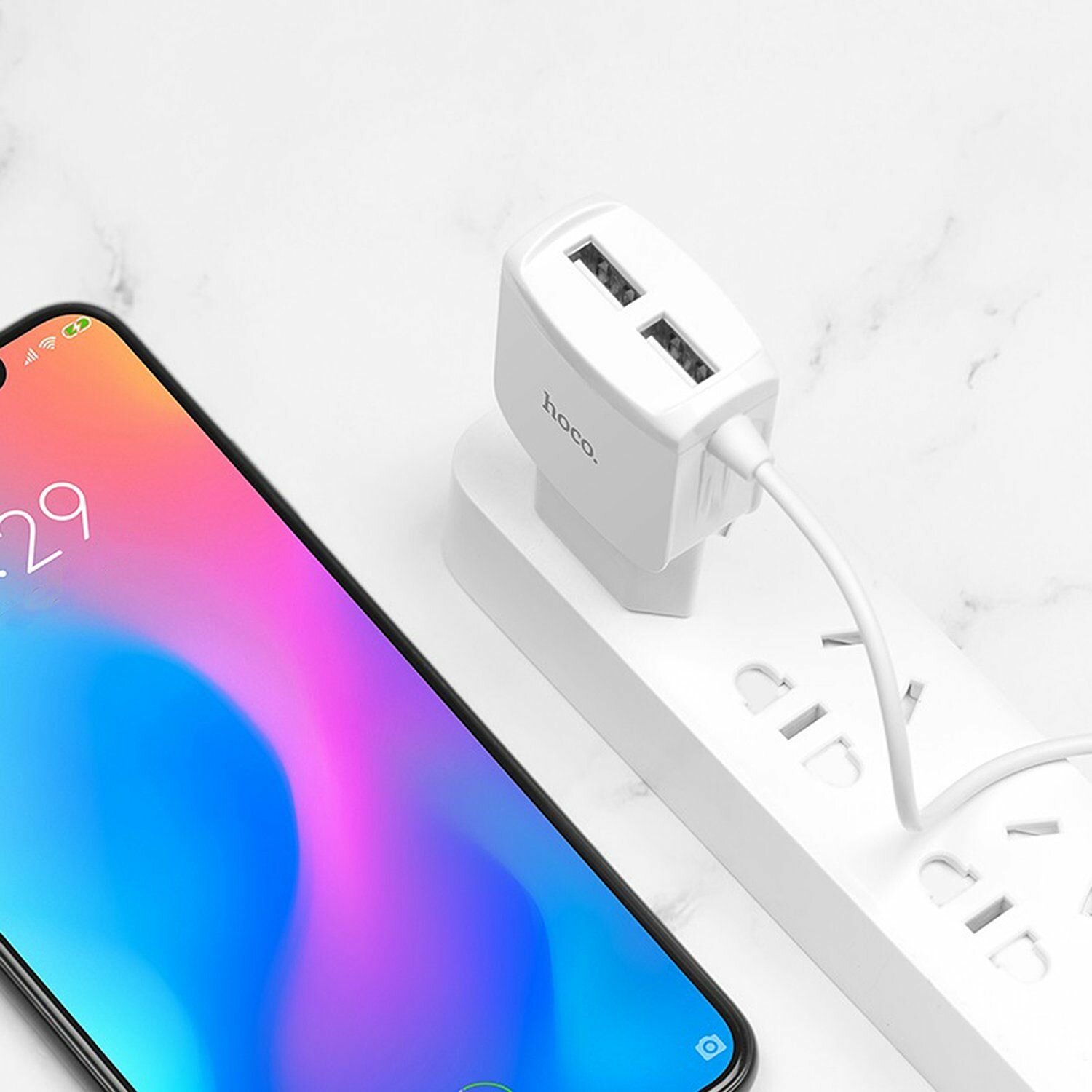 Устройство зарядное сетевое микро USB, 2 USB HOCO, C59A, Mega joy, 2100mAh, пластик, цвет белый