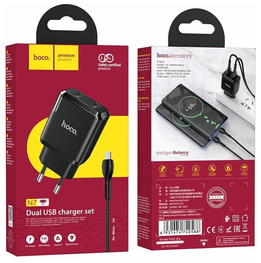 Сетевое зарядное устройство HOCO N7 Speedy 2xUSB с Кабелем USB - Micro, 2.1A, 10W, черный