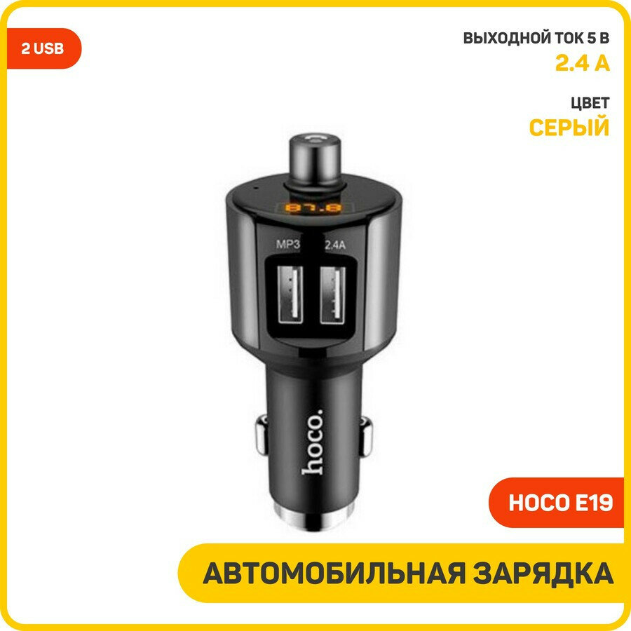 Автомобильное зарядное устройство (АЗУ) Hoco E19 (2 USB / FM-трансмиттер / Bluetooth) 2.4 А, серый