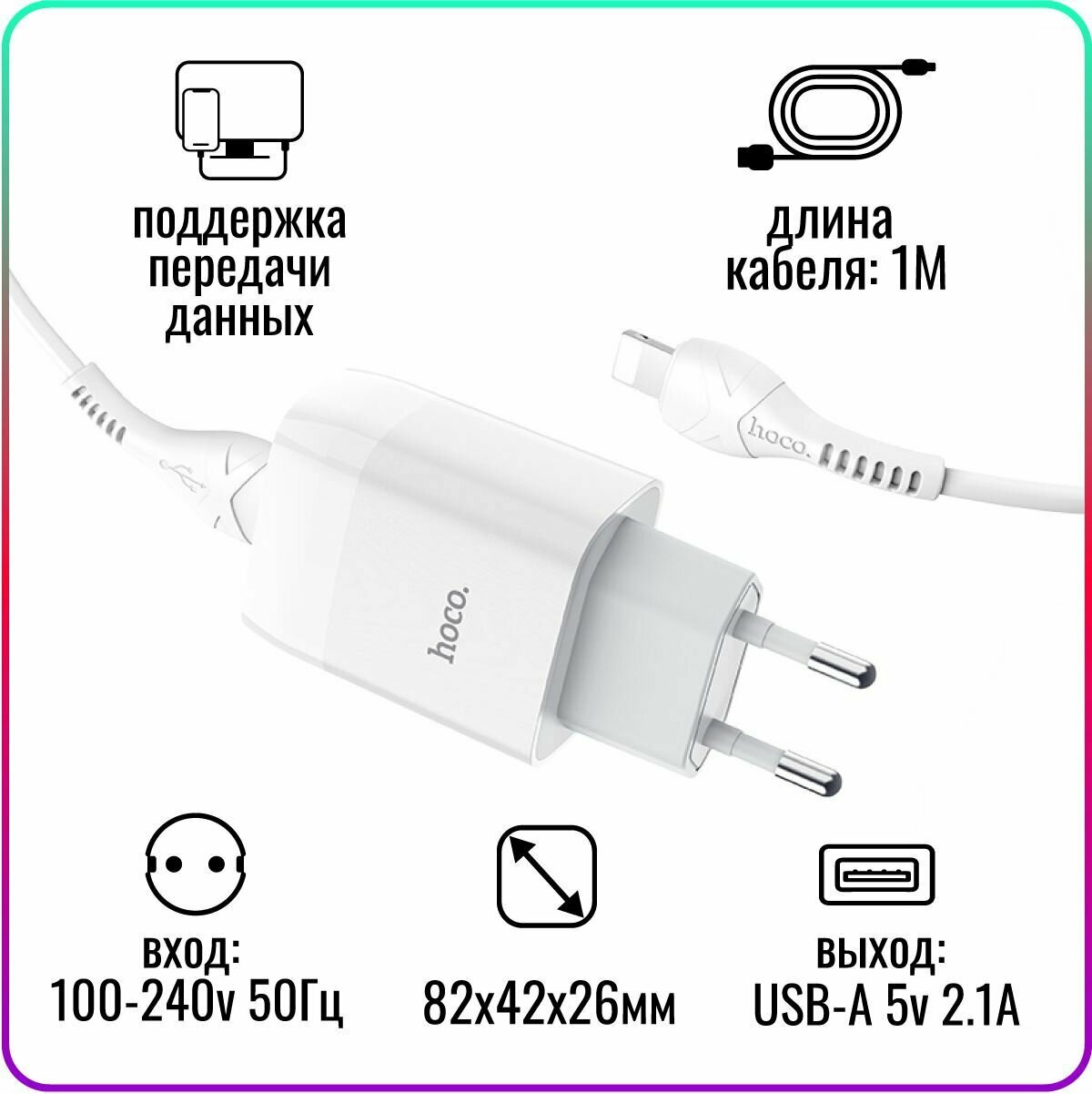 Сетевое зарядное устройство HOCO C72A Glorious 1xUSB, 2.1A + кабель Lightning 8-pin, 1м, белый