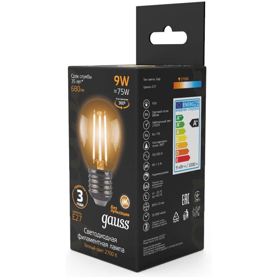 Лампа филаментная Gauss 9Вт цок.:E27 шар 220B 2700K св.свеч.бел.теп. G45 (упак.:10шт) (105802109)