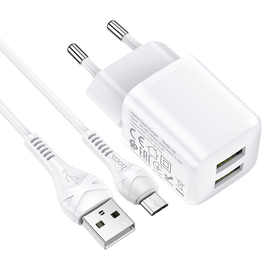 Сетевое зарядное устройство HOCO N8 Briar 2xUSB с Кабелем USB - Micro, 2.4A, 10.8W, белый