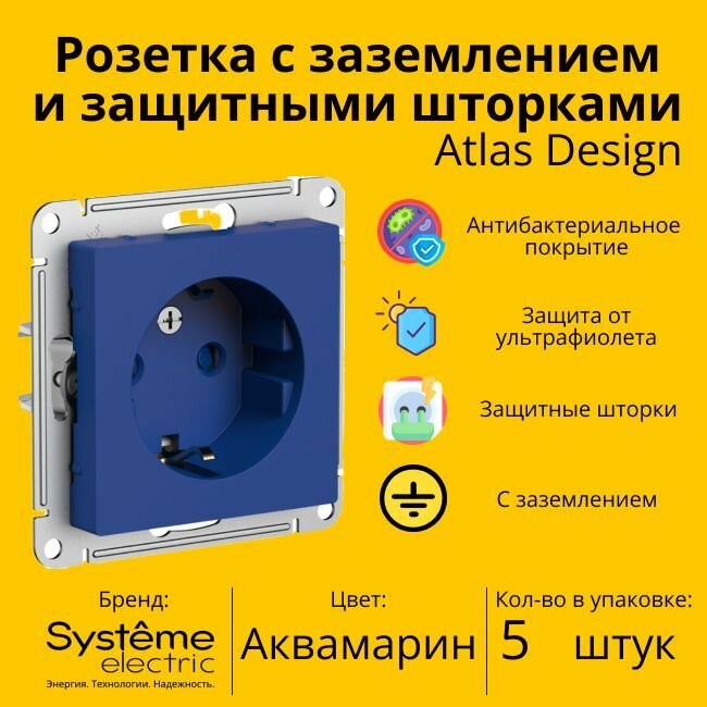 Розетка электрическая Systeme Electric Atlas Design с заземлением и с защитными шторками, 16А Аквамарин ATN001145 - 5 шт.