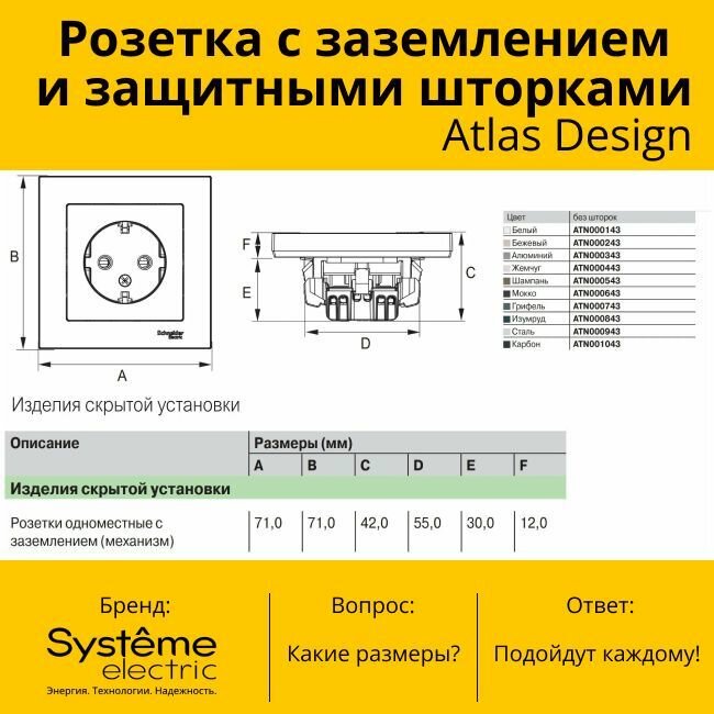 Schneider/Systeme Electric ATLASDESIGN РОЗЕТКА с заземлением со шторками, 16А, механизм, Лотос ATN001345 комплект 10 шт