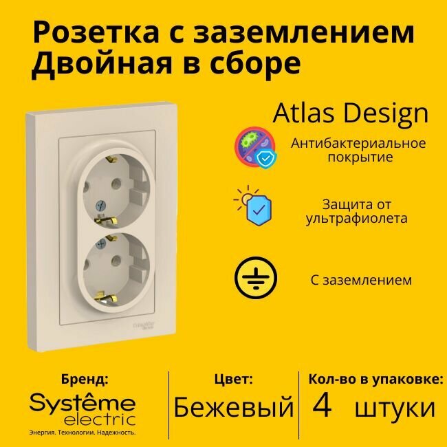 СохранитьРозетка двухместная Systeme Electric Atlas Design с заземлением, в сборе, Бежевый ATN000224 - 4 шт. интересное: