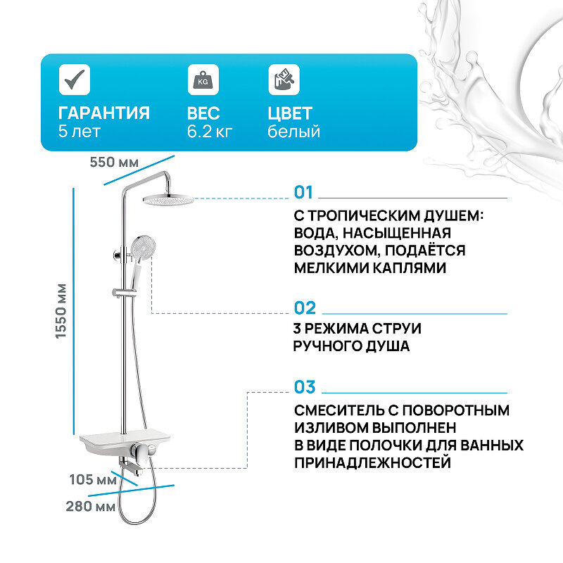 | Комплектация | Смеситель / верхний душ / ручная лейка / штанга / шланг для душа / полочка |