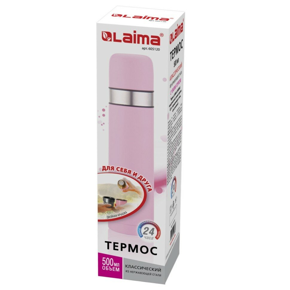 Купить Термос LAIMA классический с узким горлом (2 чашки) 0,5 л, нержавеющая сталь, розовый, 605120 В комплекте: 1шт.