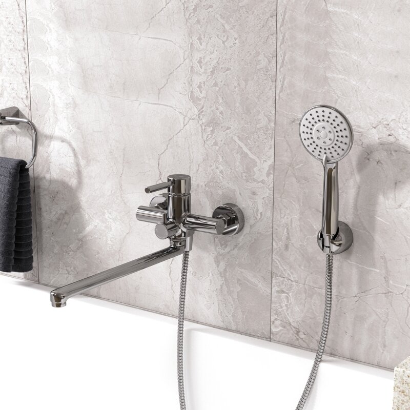 СохранитьСмеситель для ванны и душа с длинным изливом и лейкой интересное: