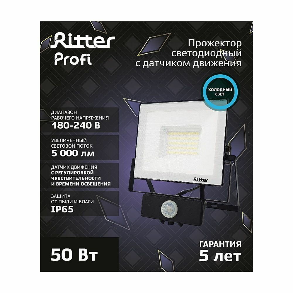 Ritter Прожектор светодиодный 50Вт уличный, с датчиком движения, холодный свет 6500К, IP65, серия PROFI 53422 2