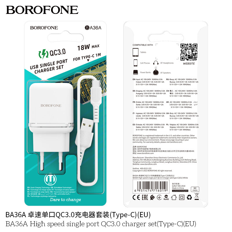 Сетевое зарядное устройство Borofone BA36A High Speed + кабель USB Type-C, 18 Вт, белый