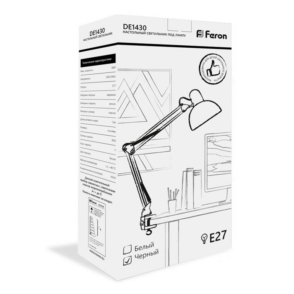 Светильник настольный (лампа) Feron DE1430 под патрон E27 на струбцине, черный, 24233