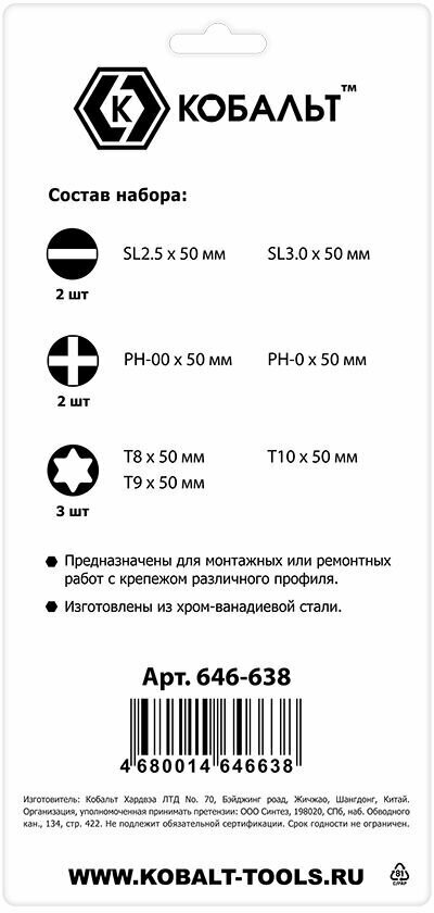 Набор отверток для точных работ кобальт Ultra Grip 50 мм, SL2.5;SL3.0; PH00;PH0; T8;T9;T10 (646-638)