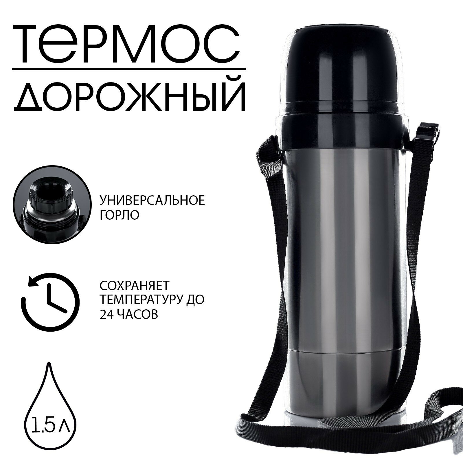 Термос "Амет. Дорожный" 1с669, с узким горлом, 1.5 л, 56 °С, 24 ч, на ремне интересное: