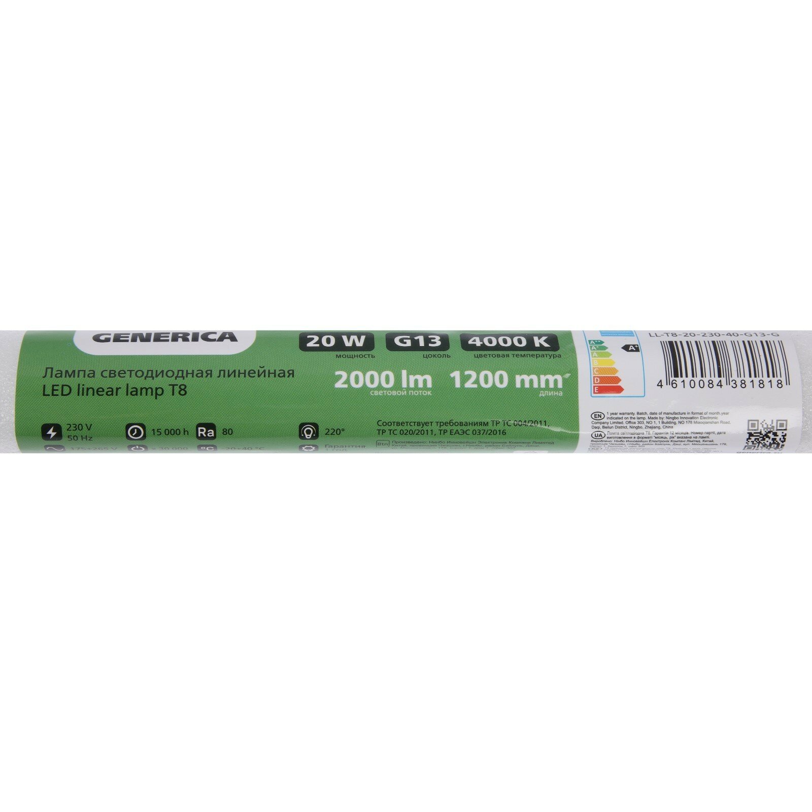 Лампа светодиодная GENERICA, 20 Вт, T8, линейная, 1200 мм, 4000 К, G13, 230 В, LL-T8-20-230-40-G13-G