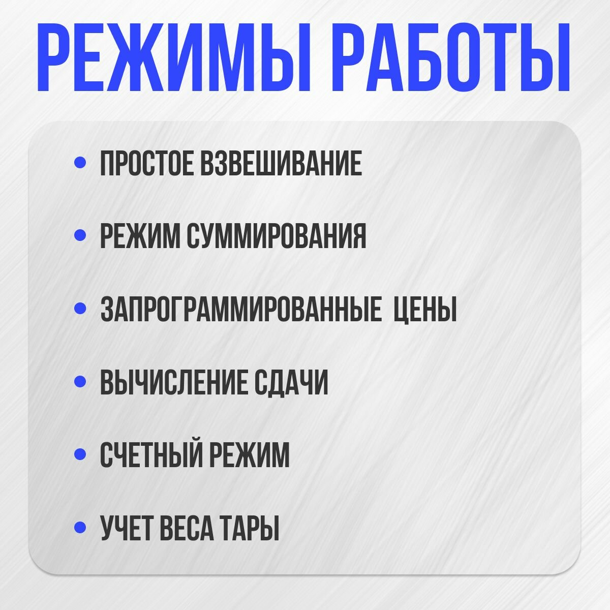 | Функции | взвешивание / вычитание массы тары / расчет сдачи / суммирование массы / счетный режим |