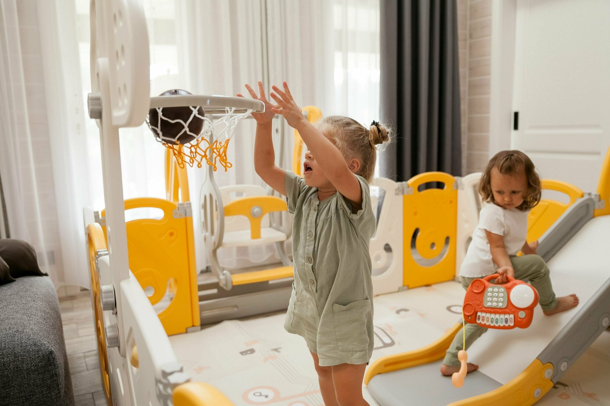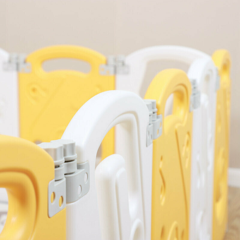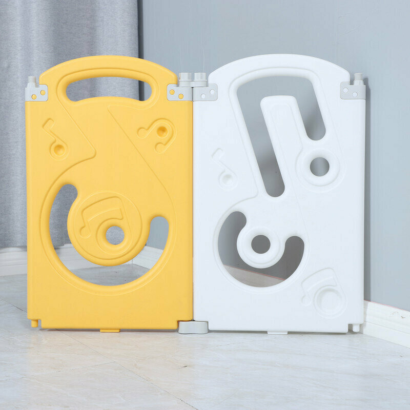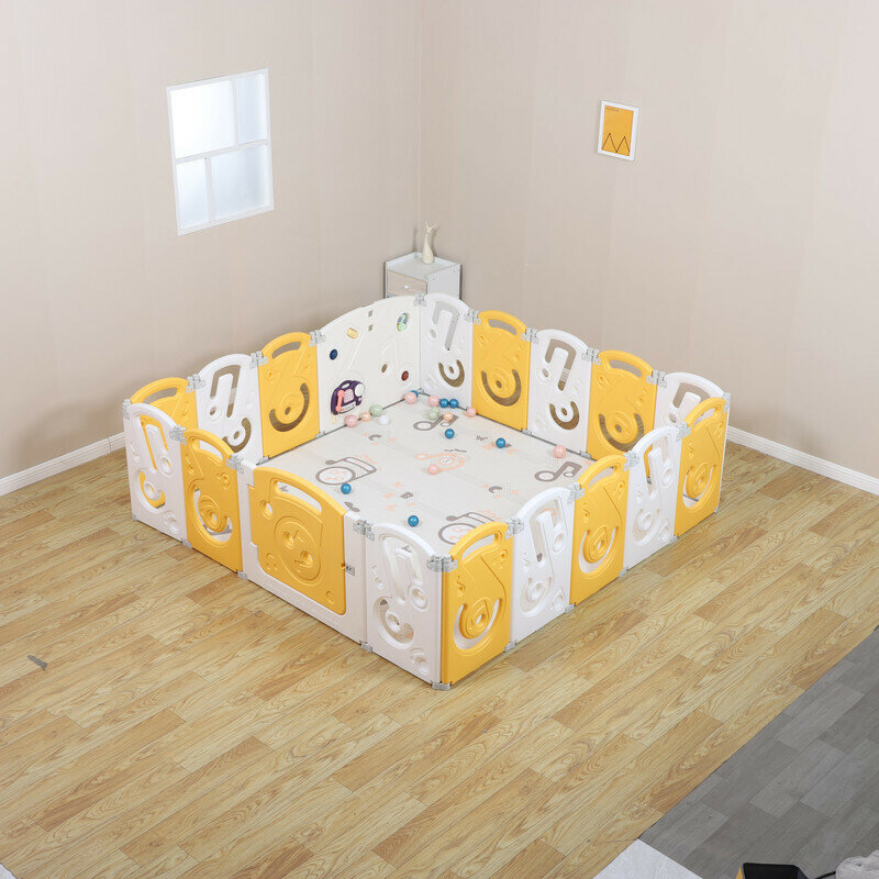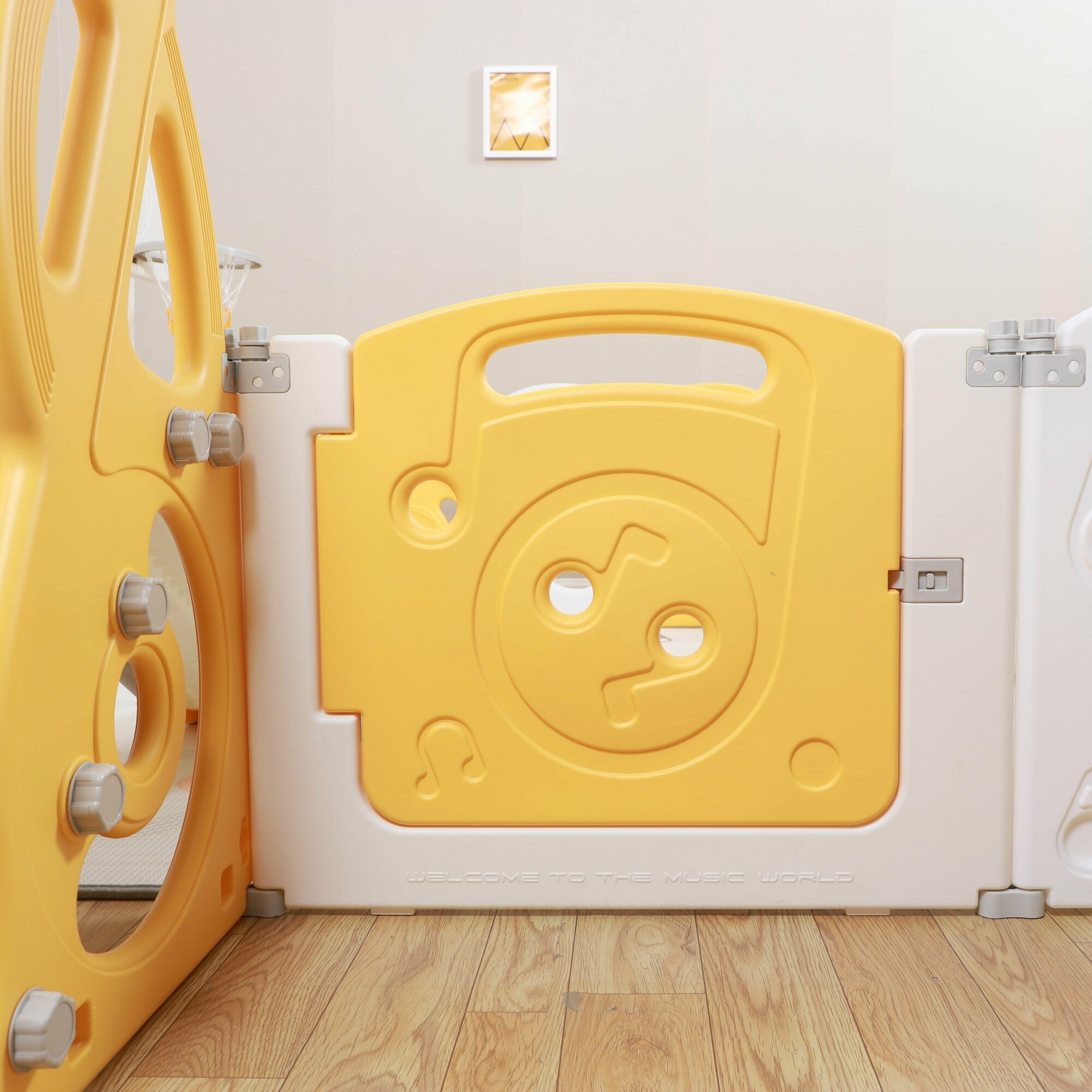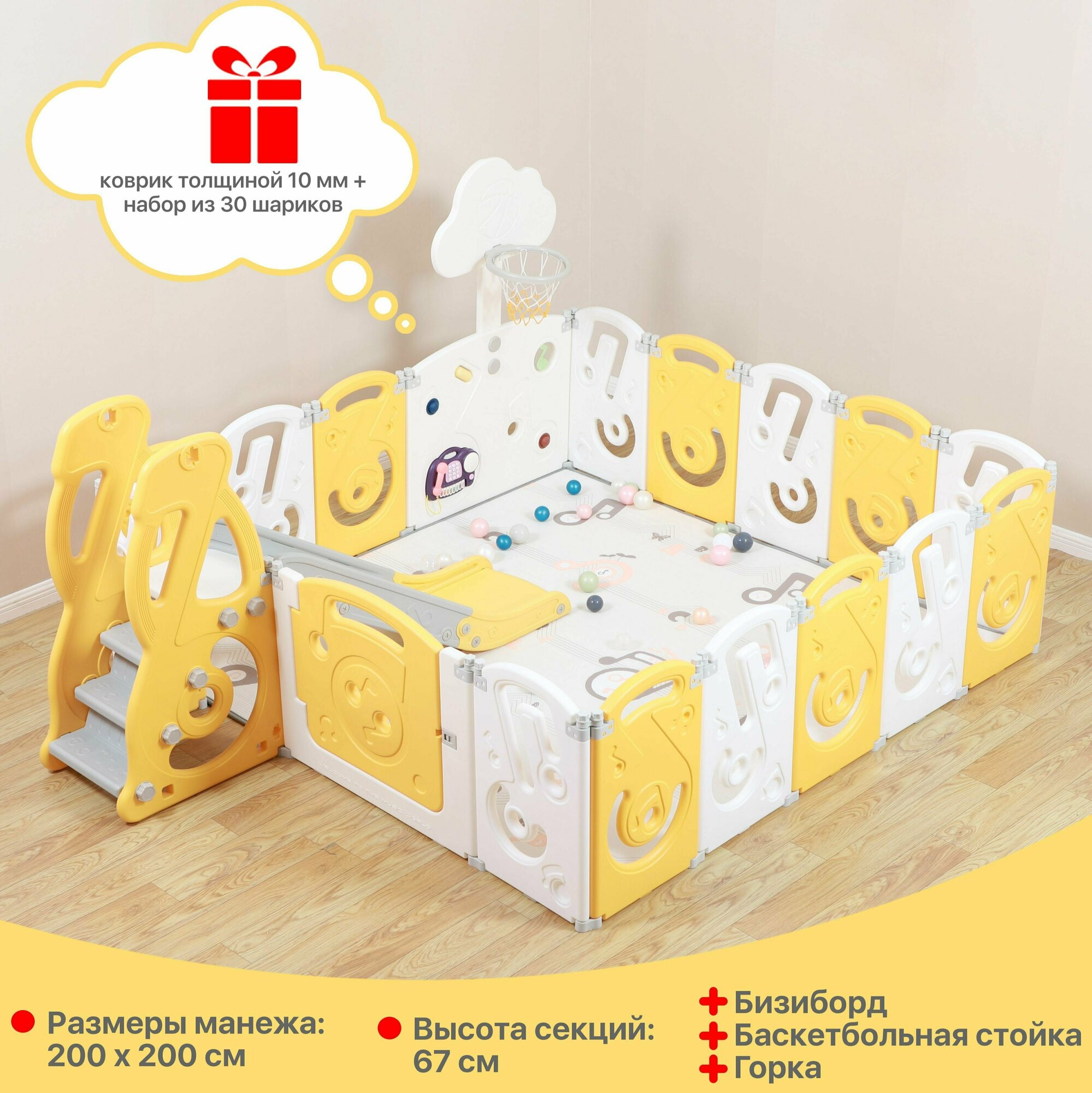 Манеж UNIX Kids "SUPREME Music" Yellow, желтый/белый, 200x200 см, с ковриком, горкой и баскетбольным кольцом для дома и улицы